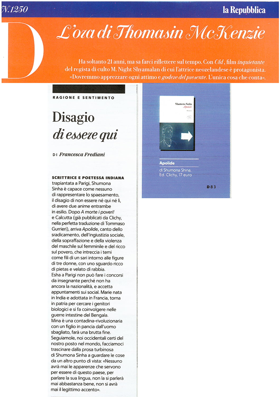 «Soltanto una scrittrice donna con una storia estrema come la sua avrebbe potuto ribaltare, come fa Shumona Sinha in questo suo terzo straordinario romanzo, tutte le nostre certezze di corretti e moralmente irreprensibili occidentali» L’Express