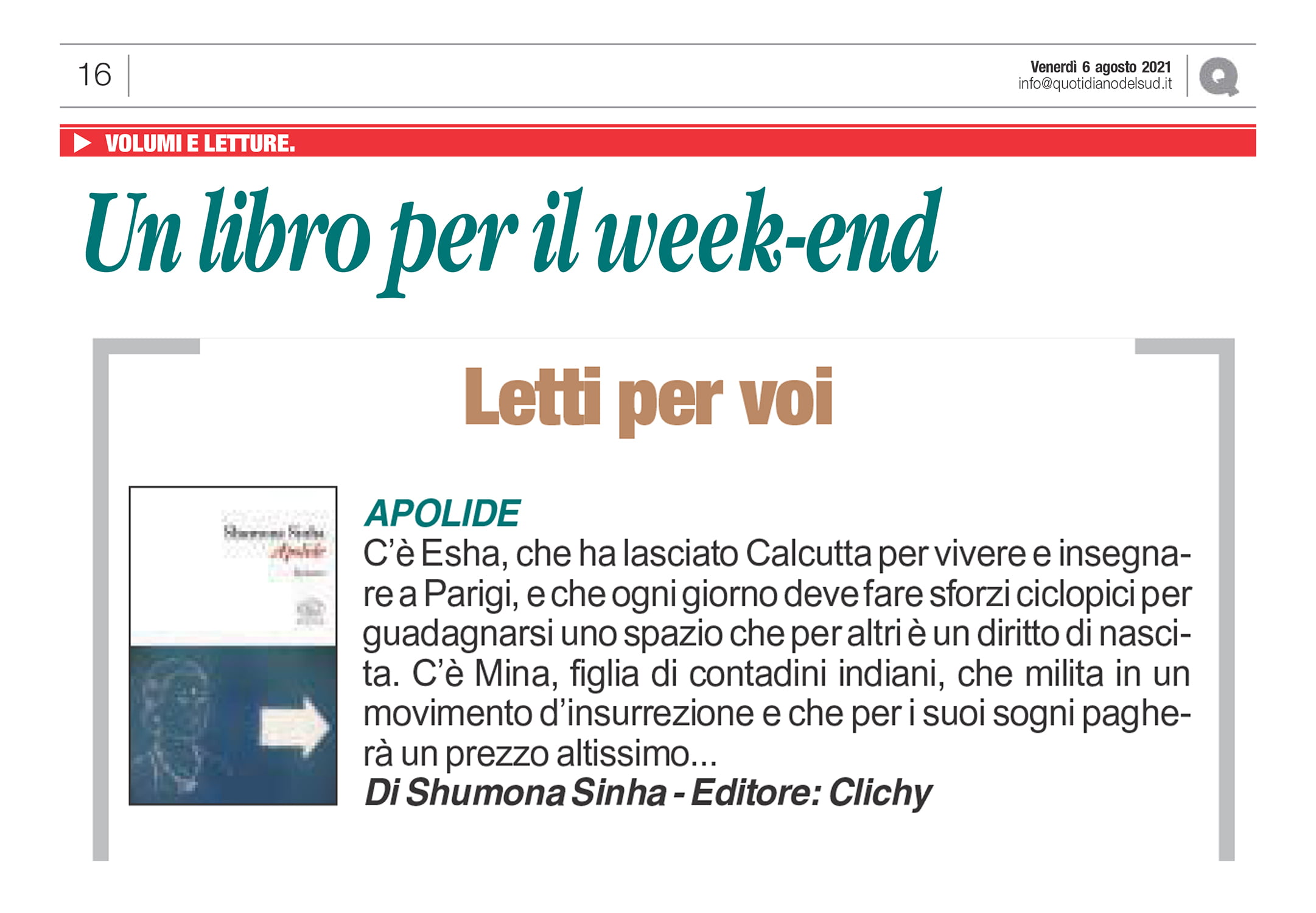 Tre destini che si specchiano e si incrociano tra India ed Europa, in un romanzo denso di poesia che non risparmia né la nostra società né quella indiana e in cui si sprigiona una violenza letteraria inaudita. Ovunque il corpo delle donne, soprattutto se sole e libere, è terreno di caccia e di conquista, viene continuamente invaso da sguardi indesiderati e feroci, braccato, ferito. Le vite di Esha, Mina e Marie sono tre note di una stessa canzone struggente e bellissima che ci parla di esilio, appartenenza, libertà. Come negli altri suoi romanzi, anche in questo Apolide la suggestiva scrittura di Shumona Sinha è animata dalla collera, una collera eloquente e sacra, ricca di immagini potenti e impossibili da dimenticare.