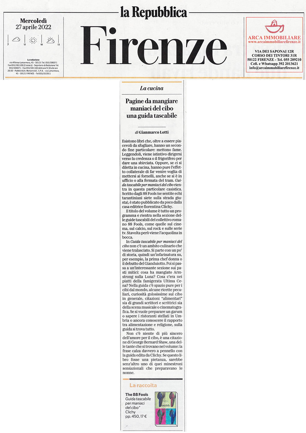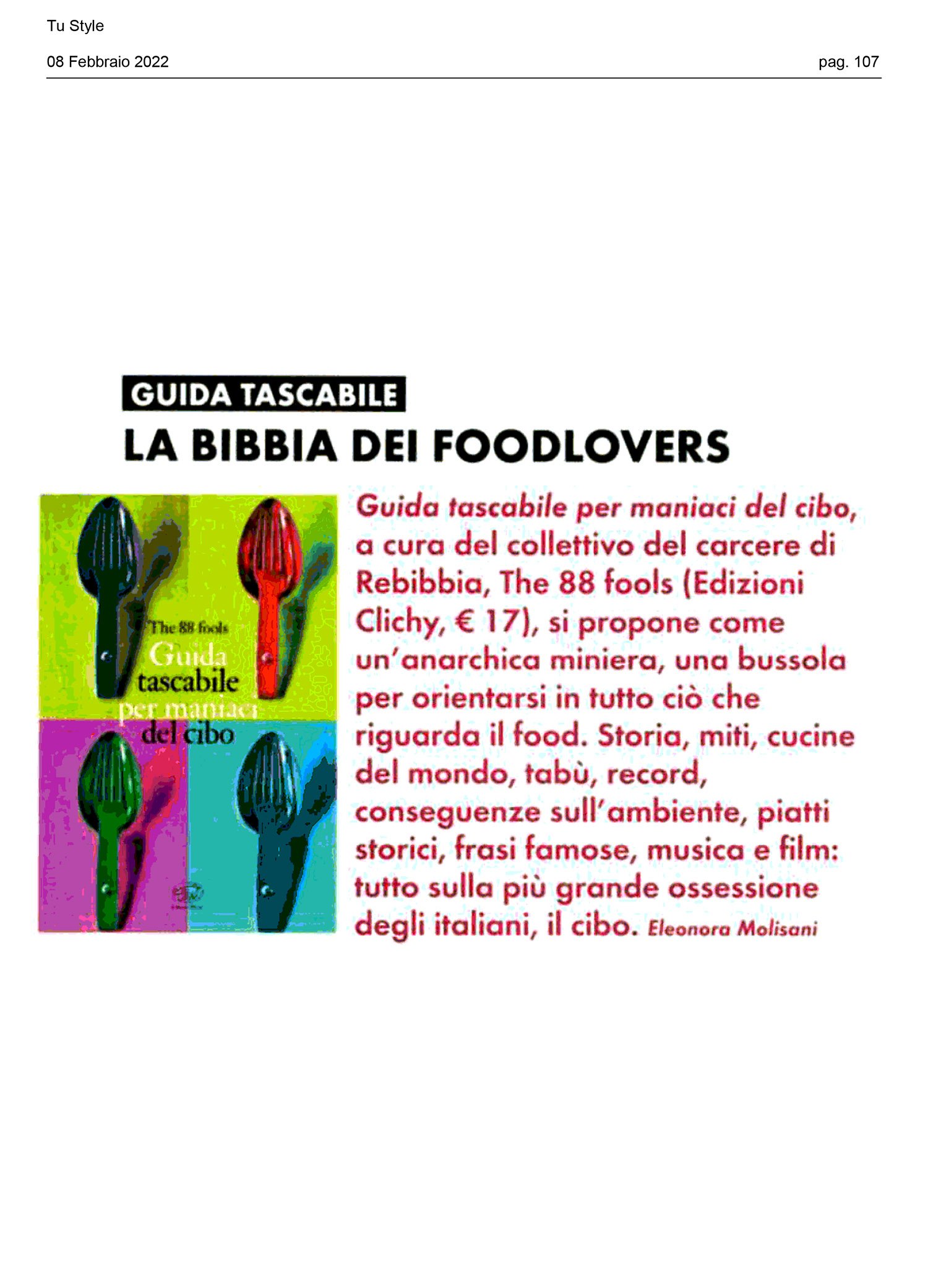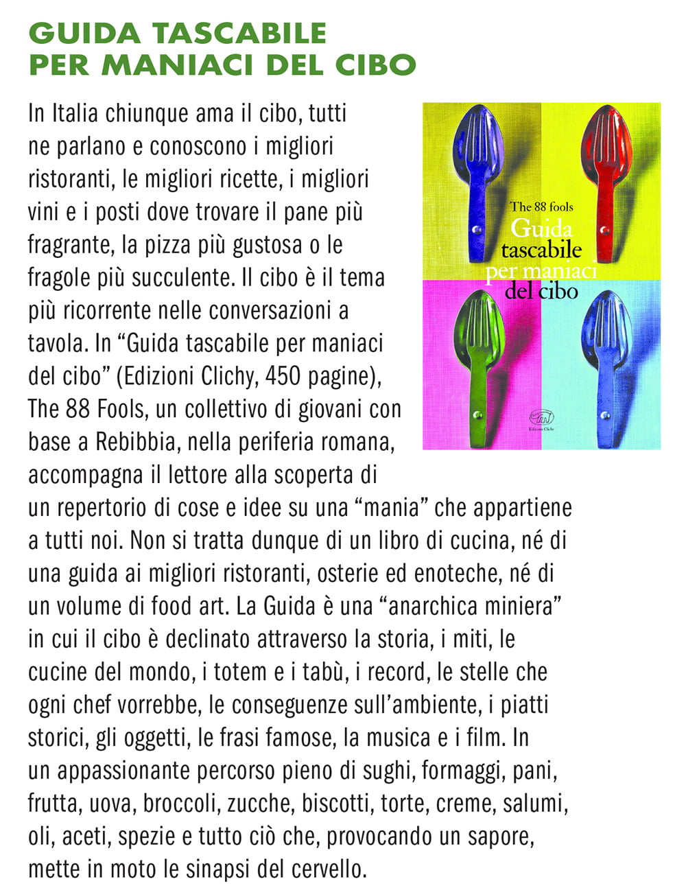 Questo non è un libro di cucina, né una guida ai migliori ristoranti, osterie, enoteche, locali slow food. Questo non è un libro di ricette. Questo non è un libro di food art. Questo non è un libro sugli chef. Questo non è niente di ciò che sicuramente avrete già visto, letto, amato, consultato, divorato. Questo è un libro su una mania che tutti gli italiani possiedono in misura smodata: il cibo. È stato stimato che tra gli argomenti trattati in qualsiasi pasto in compagnia che si svolge nel nostro Paese, il primo posto è stabilmente occupato dal cibo, con il 77%. Al secondo posto c’è la salute, con il 7%, seguono il vino (6%), il calcio (3%), i parenti (2%), gli amici (1%) e poi, con percentuali infime, il cinema, i viaggi, il lavoro, il sesso, i libri e infine la politica. Questo libro, allo stesso modo di tutte le nostre Guide tascabili per maniaci, si propone come una specie di anarchica miniera, come una bussola, una spelonca, una cornucopia per perdersi in tutto ciò che riguarda il cibo. Declinato attraverso la storia, i miti, le cucine del mondo, i totem e i tabù, i record, le stelle (quelle conquistate e che ogni chef vorrebbe), le conseguenze sull’ambiente, i piatti storici, gli oggetti, le cose più strane, le frasi famose, la musica e i film. In un infinito, ridondante, appassionante, divertentissimo percorso pieno di sughi, formaggi, pani, frutta, uova, broccoli, zucche, biscotti, torte, creme, salumi, oli, aceti, spezie e tutto ciò che provocando un sapore mette in moto le sinapsi del cervello e quindi la ricerca di un senso, la memoria, l’amore, la nostalgia, lo smarrimento, il godimento, a volte perfino la felicità.