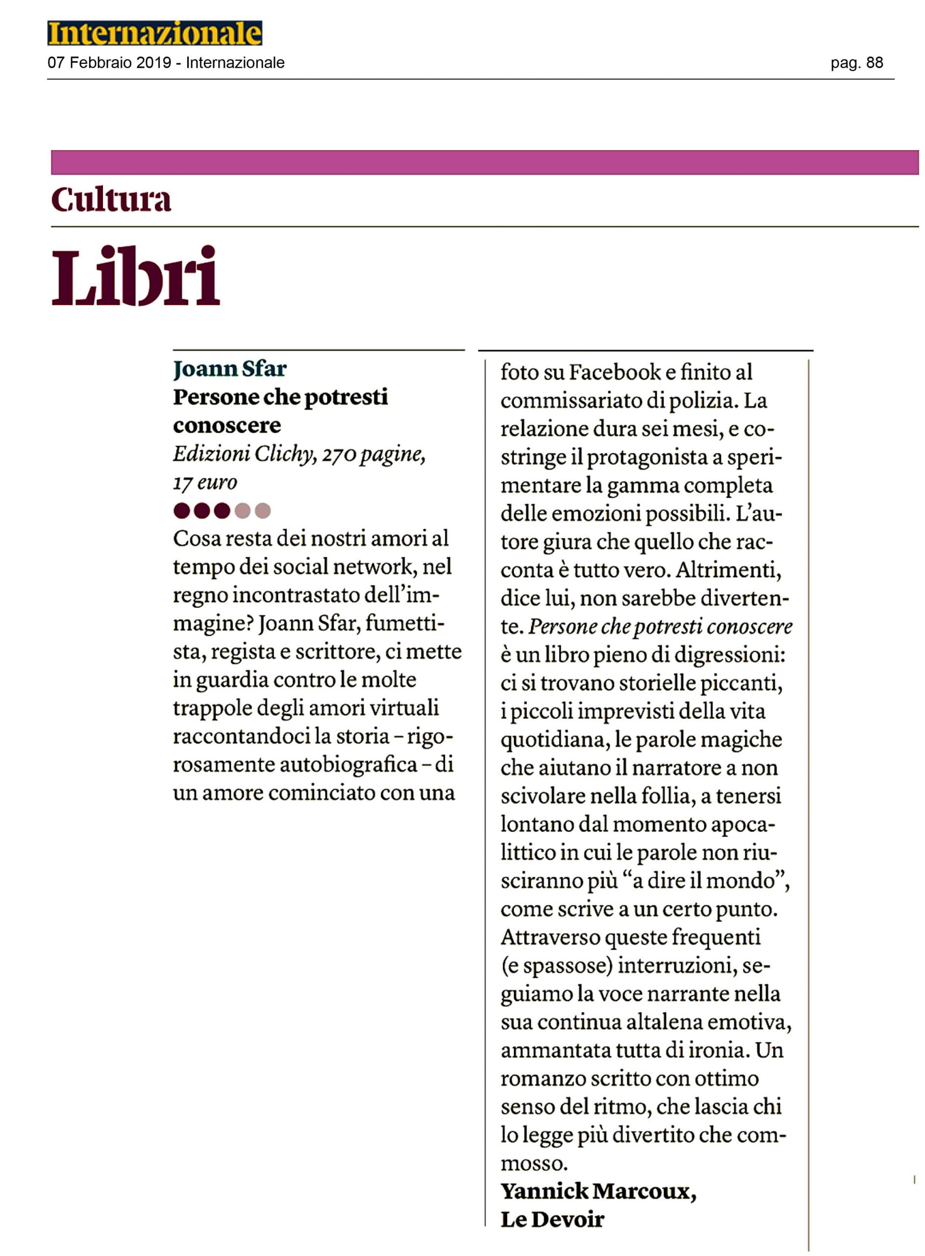Il problema è l’empatia, l’incapacità di impedire a se stessi di mettersi comunque in ascolto degli altri e del mondo. E che il mondo non sempre corrisponde all’idea che ci se ne fa. Se poi ci si è lasciati da un amore tormentato e si cerca consolazione e compagnia sui social, il rischio di cadere in una assurda e falsa trappola sentimentale è altissimo. Si comincia cliccando sulla foto profilo di una ragazza tra le «Persone che potresti conoscere» su Facebook, e ci si ritrova in una stazione di polizia. Si prosegue prendendo un cane e preoccupandosi che non mangi i propri gatti. Alla fine non si riesce a trovare pace per sei mesi. Ed è una storia vera… Un nuovo indispensabile capitolo del percorso autobiografico di Joann Sfar, scrittore dall’animo delicato ma tormentato, falsamente ingenuo e gioiosamente ipocondriaco, brillante, generoso e irresistibile come non mai. Uno straordinario romanzo sulla distanza tra realtà e rappresentazione, sull’arte, sulla creazione, sul sogno, e alla fine e soprattutto sull’amore e sul bisogno d’amore.