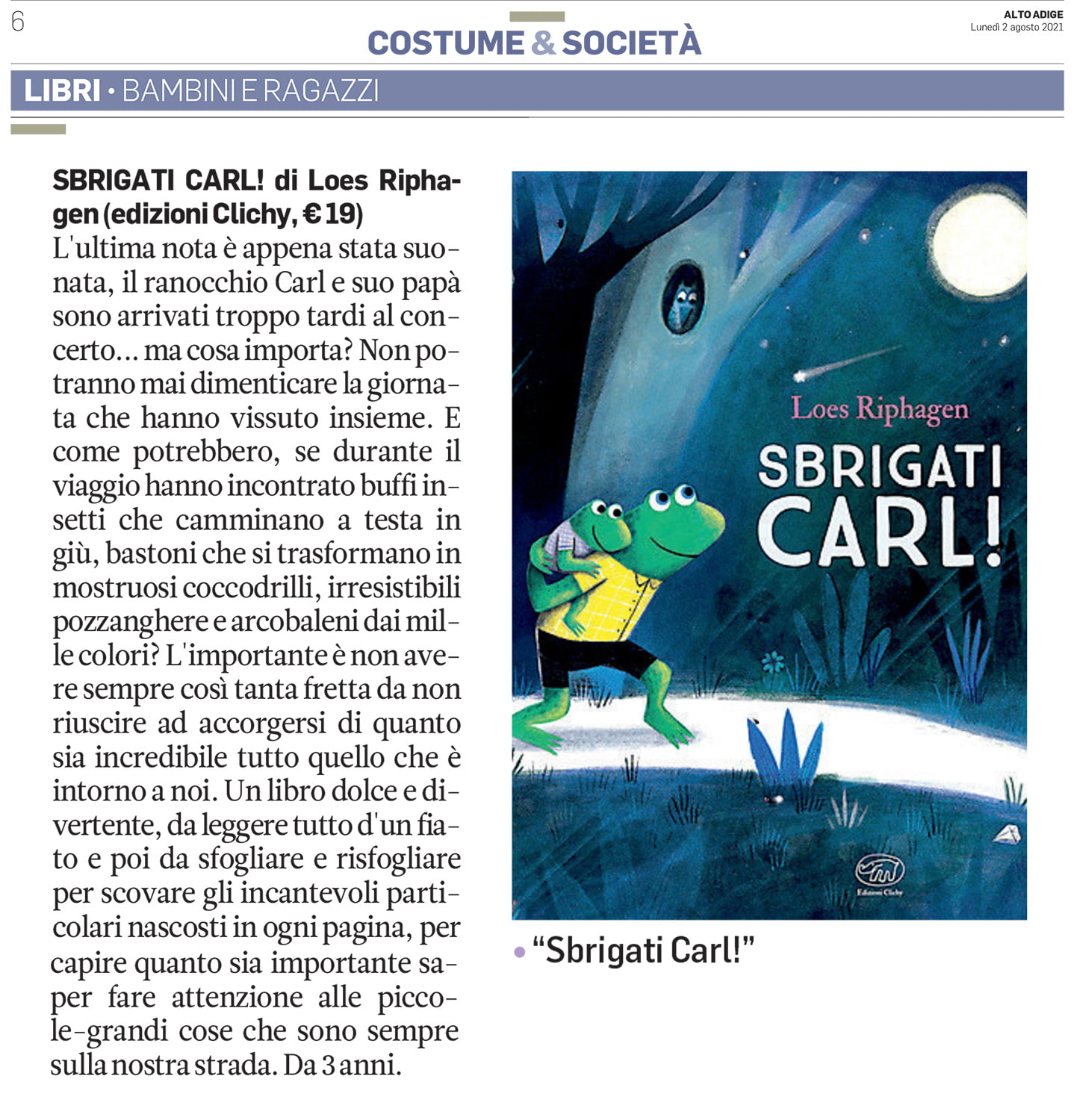 L’ultima nota è appena stata suonata, il ranocchio Carl e suo papà sono arrivati troppo tardi al concerto… ma cosa importa? Non potranno mai dimenticare la giornata che hanno vissuto insieme! E come potrebbero, se durante il viaggio hanno incontrato buffi insetti che camminano a testa in giù, bastoni che si trasformano in mostruosi coccodrilli, irresistibili pozzanghere e arcobaleni dai mille colori? L’importante è non avere sempre così tanta fretta da non riuscire ad accorgersi di quanto sia incredibile tutto quello che è intorno a noi… Un libro dolce e divertente, magistralmente illustrato, da leggere tutto d’un fiato e poi da sfogliare e risfogliare all’infinito per scovare gli incantevoli particolari nascosti in ogni pagina, che mostra quanto sia importante saper fare attenzione alle piccole grandi cose che sono sempre sulla nostra strada… e che possono anche salvarci!